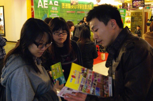 活动现场,侨谊留学的顾问耐心详细的向同学们介绍AEAS澳洲精英中学展,免费获得入场券的同学们,除了可以凭券参加3月12日花园酒店当日的澳洲精英中学展之外,更可凭副券多次享受华南影都五折电影券的优惠。