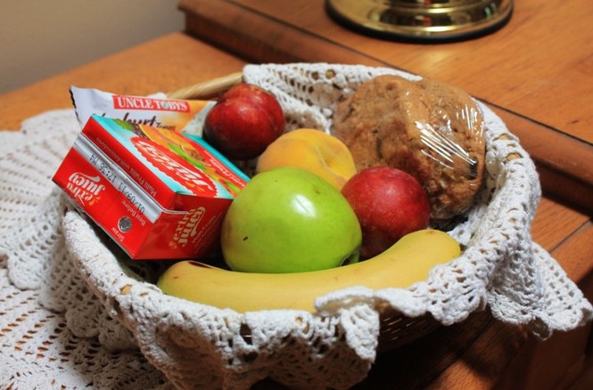 晚餐后我们和其他wwoofers聊了一个会,已经快十点了,我们赶紧准备回宿舍睡觉了,明天早上七点要gathering。回到宿舍,我发现在床头放置了一篮子水果和饼干,原来这是农场送给每一位新来wwoofer的礼物,感觉好窝心好温暖啊!