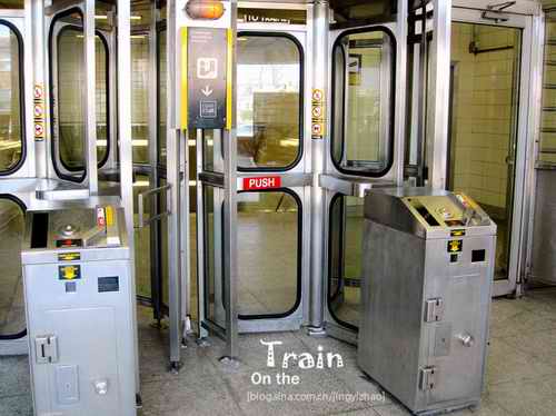 想要进入地铁呢,就要从这个门推进去。有两种方式进去,第一种是用车票。多伦多的车票叫做Token,是一种小硬币。可以在下面这个机器买到。