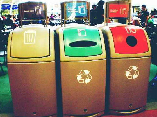 吃完东西,要自己把垃圾分类丢掉,不要留在桌子上。从左依次是,一般垃圾,纸类垃圾,瓶瓶罐罐垃圾。