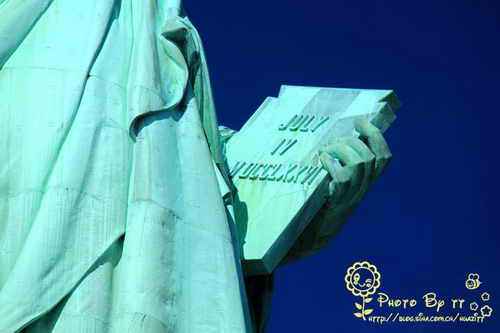 左手紧抱一部象征《美国独立宣言》的书板,上面刻着《宣言》发表的日期“1776.7.4”字样。