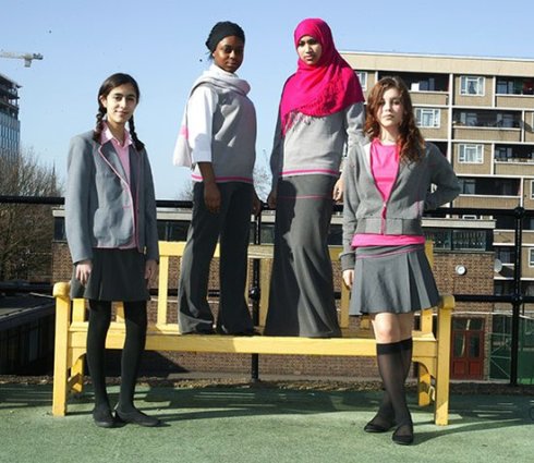 在伦敦的学校里鼓励孩子们为学校设计新的校服,这几个学生在展示她们的校服设计。这种办法可以使校服更贴近孩子们的想法,更舒服、更端庄文雅。