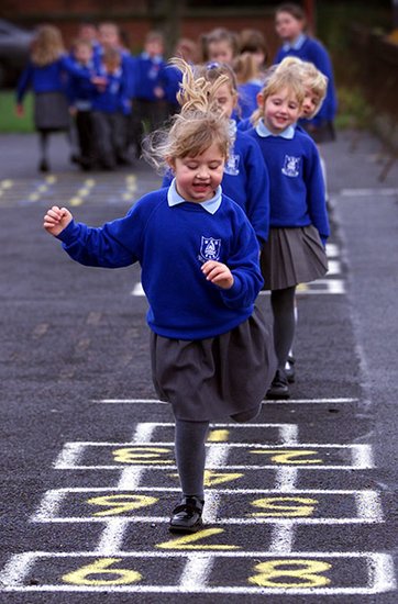 兰开夏(Lancashire)塔尔顿,密尔布劳路(Mere Brow Tarleton)的小学生穿着校服在校园里玩游戏。