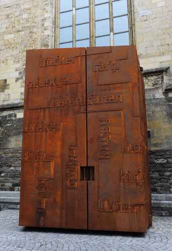 在马斯特里赫特蜿蜒的石砖道路上信步而行,宛如置身于中世纪,不知不觉间我来到城中心的Vrijthof广场附近,偶然拐进一个小巷,古老的教堂前面一座赭红色的巨大雕塑吸引了我,上前一看,才发现是一本“书”,表面雕刻着很多字母,英文的“Book”提醒了我,莫不是那个著名的教堂书店Selexyz Dominicanen?来荷兰之前在网上看到马斯特里赫特有这样一家建在13世纪教堂里的独一无二的书店,太好了,没想到这么容易就找到了。