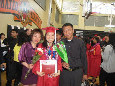 徐芦爽高中毕业典礼与母亲卢影、父亲徐晓丰合影。(美国《世界日报》/徐芦爽提供)