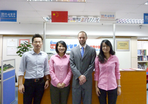 2011年10月26日,来自美国INTO集团的地区经理Tyler Nusbaum来访侨谊留学-香港学联集团中国区总部,对侨谊顾问们介绍该学校最新情况以及招生要求。