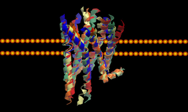 An overlay of multiple GPCR structures sitting on a cell membrane