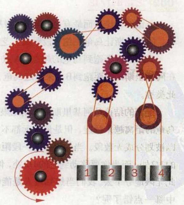 问题:如果将左下角的红色齿轮逆时针转动,图中的4个重物将分别怎样移动?哪2个向上,哪2个向下?