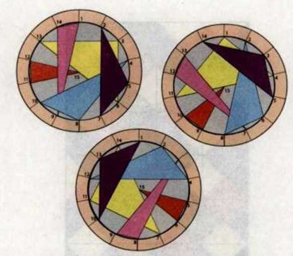 答案:解决这类问题可以使用几何方法,如图所示的就是其中一种。圆外环的14个点将圆的周长等分,内环的圆圈中包含5个彩色三角形,它以圆心(图中标的是15)为中心旋转,每次旋转两个单位,最后会形成7种不同的位置,从而每个三角形分别构成7个组,其中每组由三角形的3个顶点的数字组成。