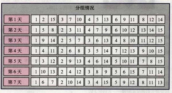 问题:15个小学生3人一组去上学,连续7天。他们的分组情况必须要满足一个条件:在7天中任意2个小学生只有1次被分到同一组。为了方便起见,我们将这15个小学生分别标上序号1〜15,你能根据所给出的条件填写分组表格吗?一共有7种解法,你能找出其中的一种吗?