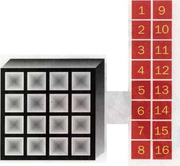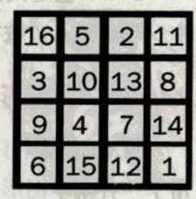 问题:将这些编号从1到16的棋子填入下图的16个方格内,使得每一行、列以及两条对角线上的和相等,且和为34。