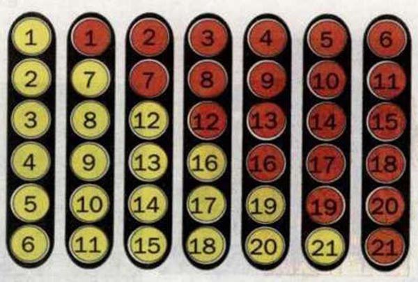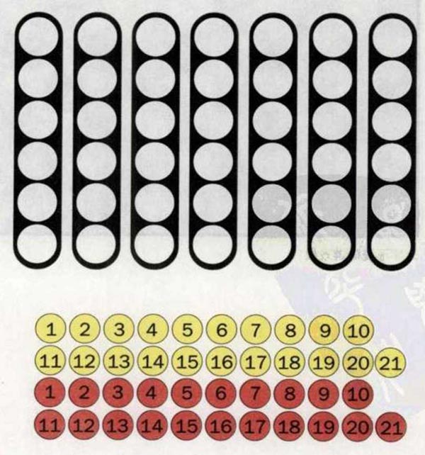 问题:有黄红两组数字卡片。请你把它们粘到下边的数字板上,使得横向相邻的两种不同颜色的卡片数字相同。