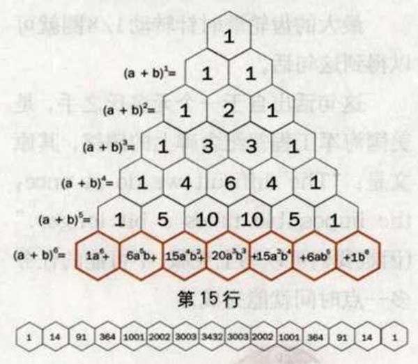 问题:数字与几何学相结合的最经典的例子之一就是著名的帕斯卡三角形。 你能够发现帕斯卡三角形的规律吗?请你将第15行补充完整。帕斯卡三角形一个显著的特点就是它第n行(顶行作为第0行)的数字分别为(a+b)n这个式子展开之后各项的系数。比如(a+b)2= 1a2+2ab+1b2 (见下图)。那么(a+b)6展开之后的式子是什么呢?
