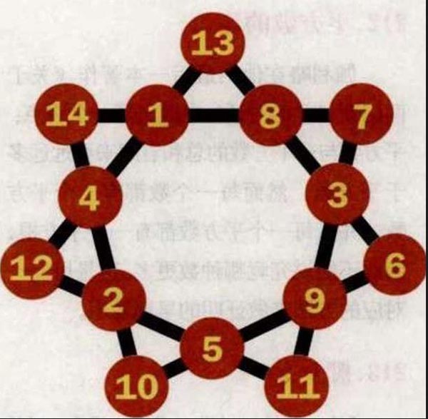 问题:你能将数字1到14填入右边的七角星圆圈内,使得每条直线上数字之和为30吗?