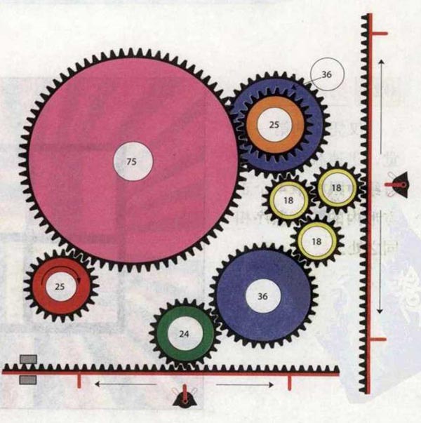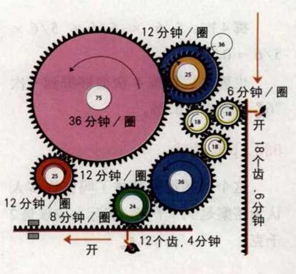 答案:黄色小齿轮将会把竖直的齿轮带向下带动18个齿,需要6分钟打开开关。绿色小齿轮将会把水平的齿轮带向左带动12个齿,需要4分钟打开开关。