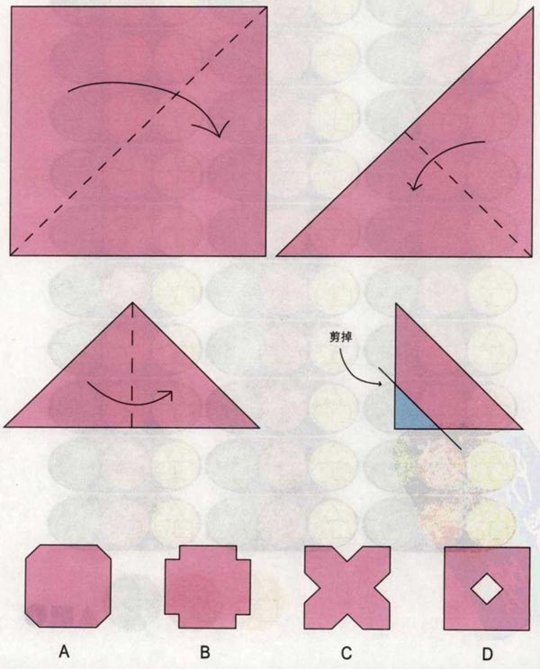 问题:将一张正方形的纸进行折叠,然后如图所示,在完成折叠的最后一个步骤之后,用剪刀剪下所折成图形的一角。如果将纸张打开,所得到的正方形将会与哪一个选项类似呢?