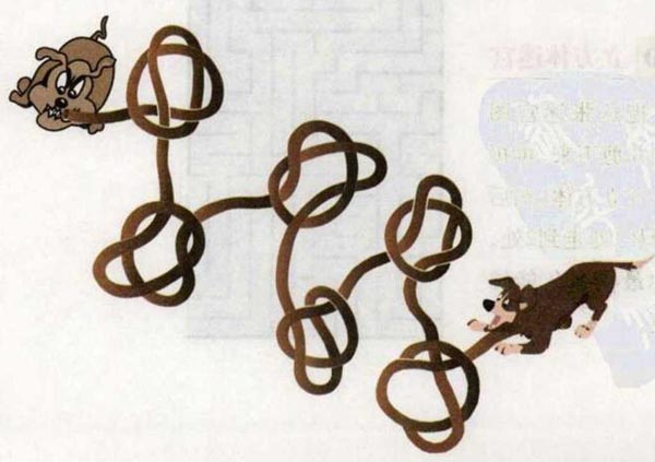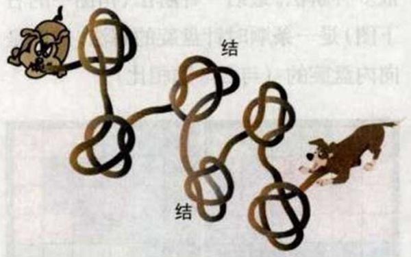 问题:如图,如果这2只狗向着相反的方向拉这根绳子,绳子将会被拉直。问拉直后的绳子上面有没有结,如果有的话,有几个?