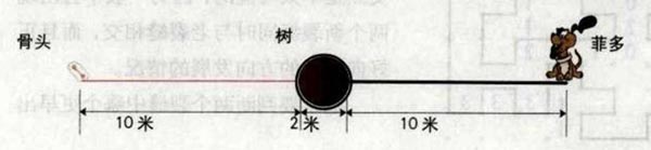答案:菲多被拴在一棵直径超过2米的粗壮的树上,所以菲多可以绕着树转一个直径为22米的圆,如下图所示。
