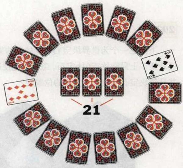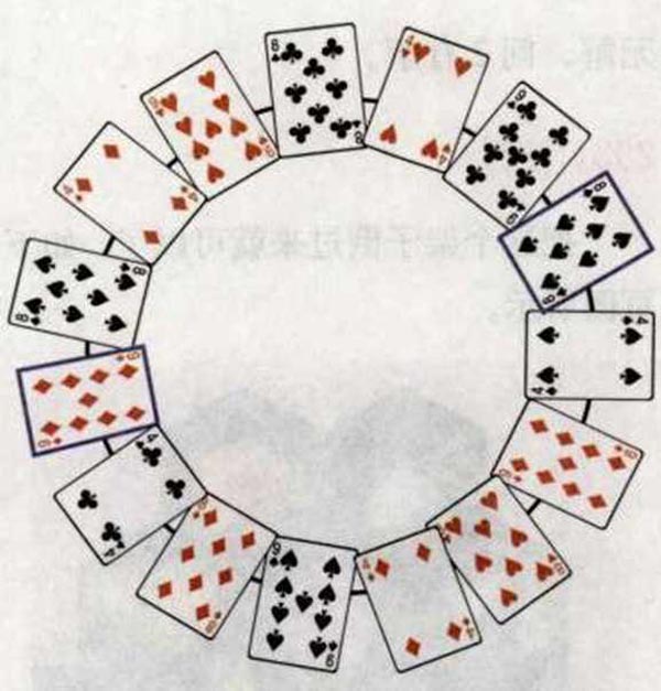 问题:如图所示,15张扑克牌摆成一个圆形,其中两张已经被翻过来了。这15张牌中每相邻3 张牌的数字总和都是21。你能否由此推出每张牌上的数字?