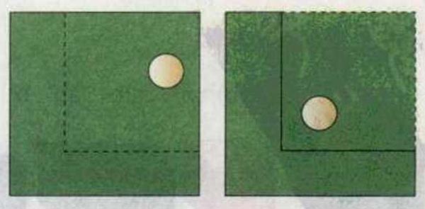 问题:这里有一张正方形的纸板,在纸板上偏离中心的位置上有一个洞。通过将这张纸板剪成两部分,并且将这两部分重新排列,就能把这个洞移到正方形中心的位置上。你知道怎么做吗?
