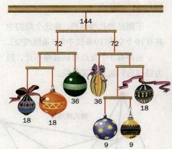 问题:这个风铃重144克(假设绳子和棒子的重量为0)。你能计算出每一个装饰物的重量吗?