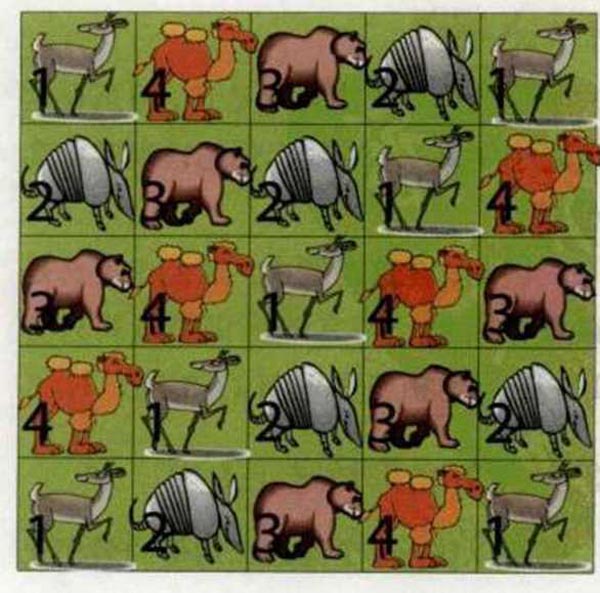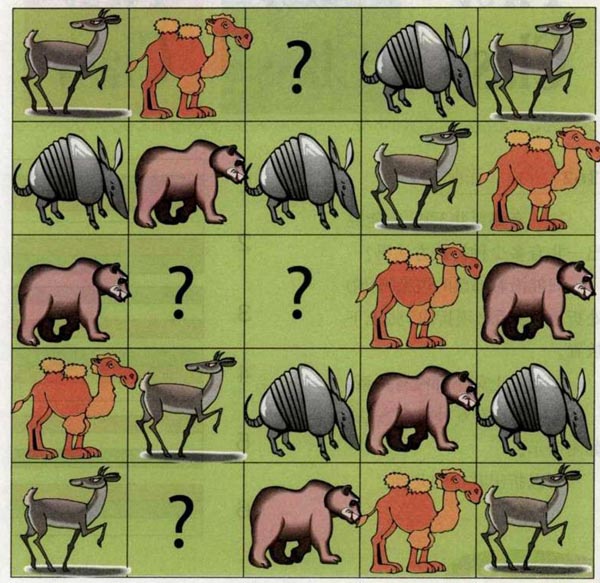 答案:如下图所示,从左下角开始,沿逆时针方向旋转,每4个动物的顺序相同。