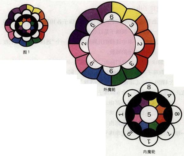 问题:将内魔轮与外魔轮以同心圆的方式咬合(结果如图1所 示)——必要时可以转动魔轮——使得任何一条直径上的数字和都相等。