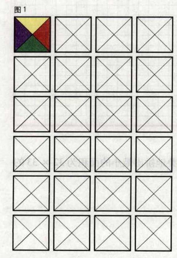 问题:一个正方形被它的对角线分成了 4部分。用4种颜色给正方形上色,上 色样板如图1所示。有6种不同的方法给正方形上色(旋转所得的正方形不算做新的正方形)。你能把它们都找出来吗? 你将每一种正方形再复制3份,组成一套24个正方形,将它们剪下来并解决这个经典的题目:你能否用这一套正方形拼成一个4 x 6的长方形,要求相邻正方形的边的颜色相同,符合多米诺骨牌风格。